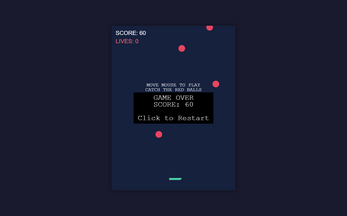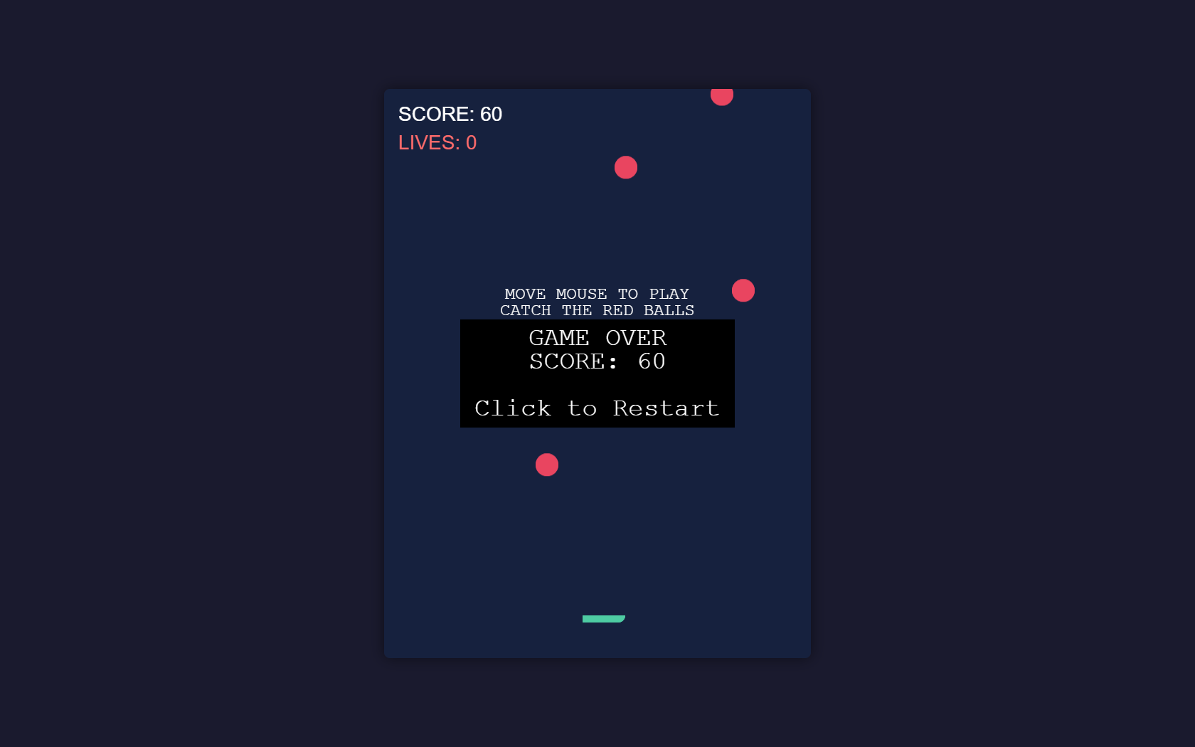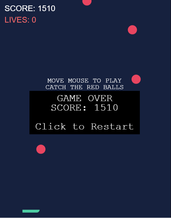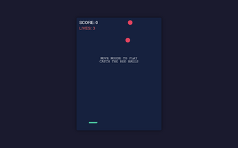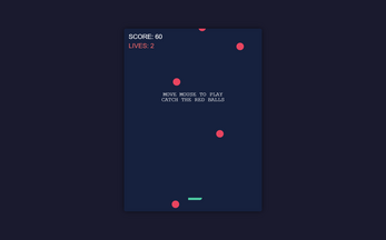 Move your mouse (or finger) to control the green platform. Catch as many falling red balls as you can! Features: - Instant gameplay, no loading screens. - Works on desktop (mouse) and mobile (touch). - Pure code-generated graphics (no external assets). - Endless arcade fun. How high can you score?
